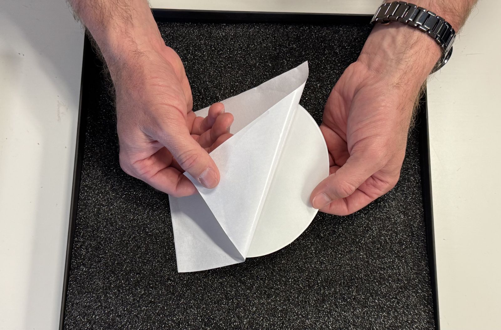 Peel the paper off the 3M metal backing and place it centrally on the back of the metal poster. Press firmly.