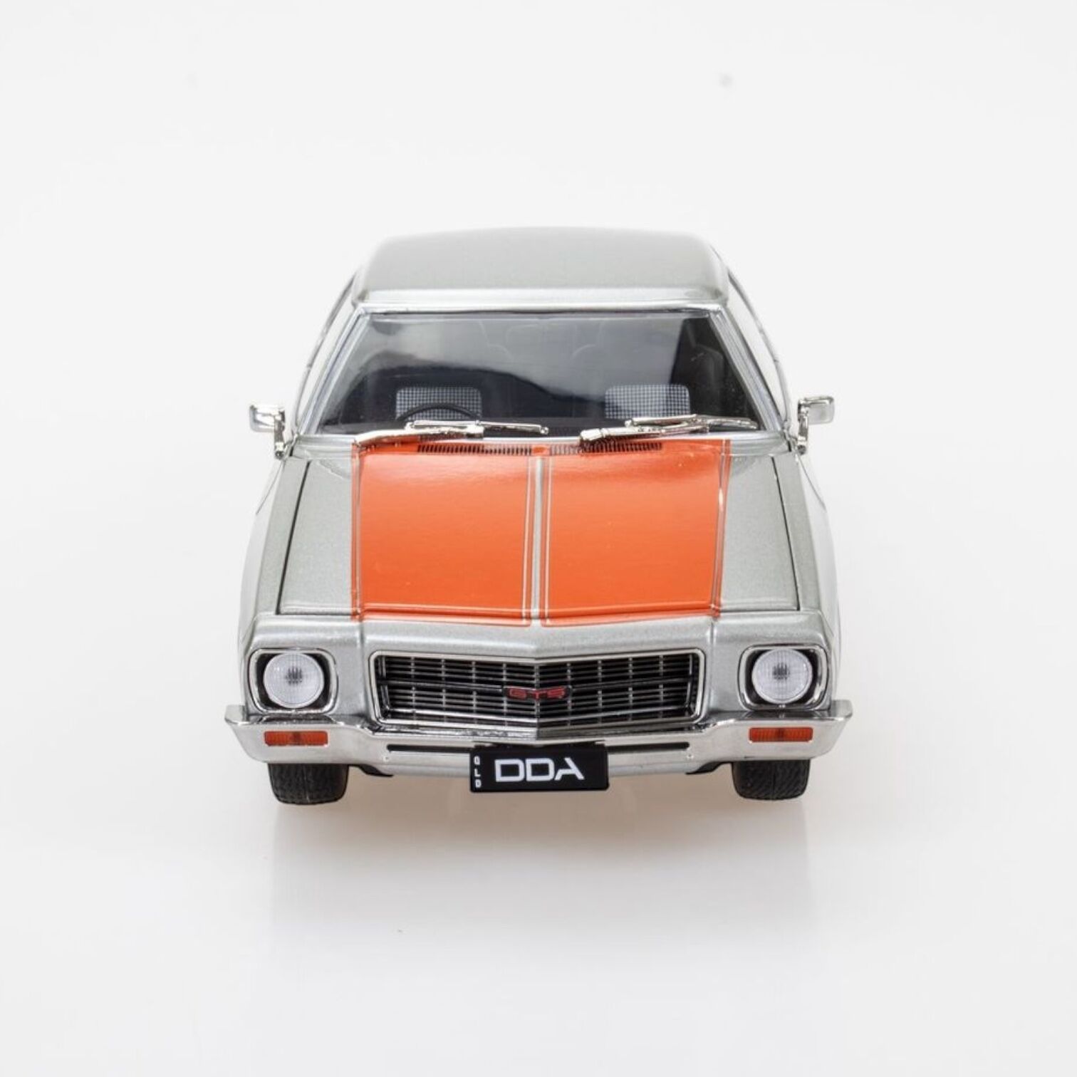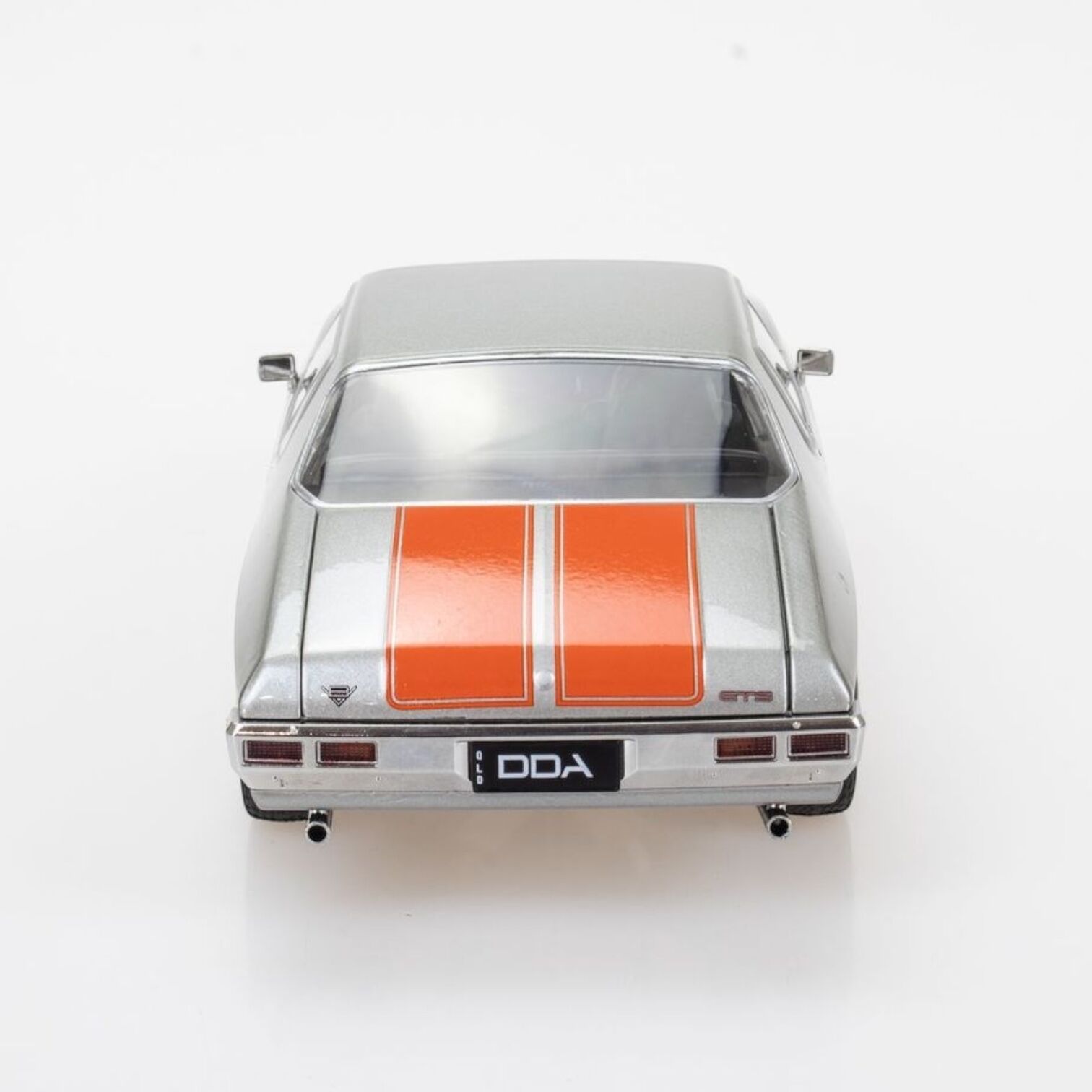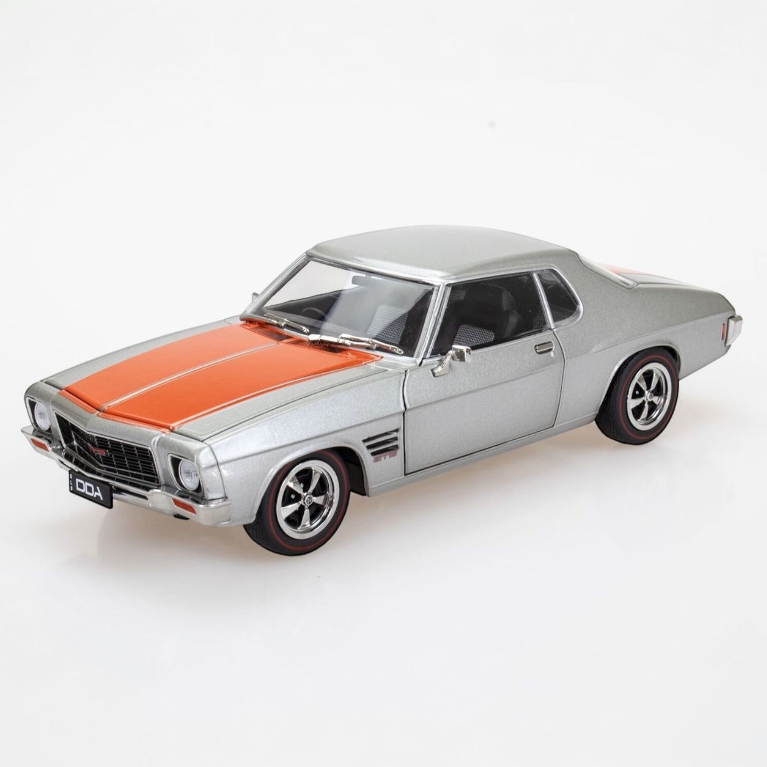 A true to scale model replica of a Silver Holden HQ Monaro 2 Door with Orange Stripe by DDA Collectables!