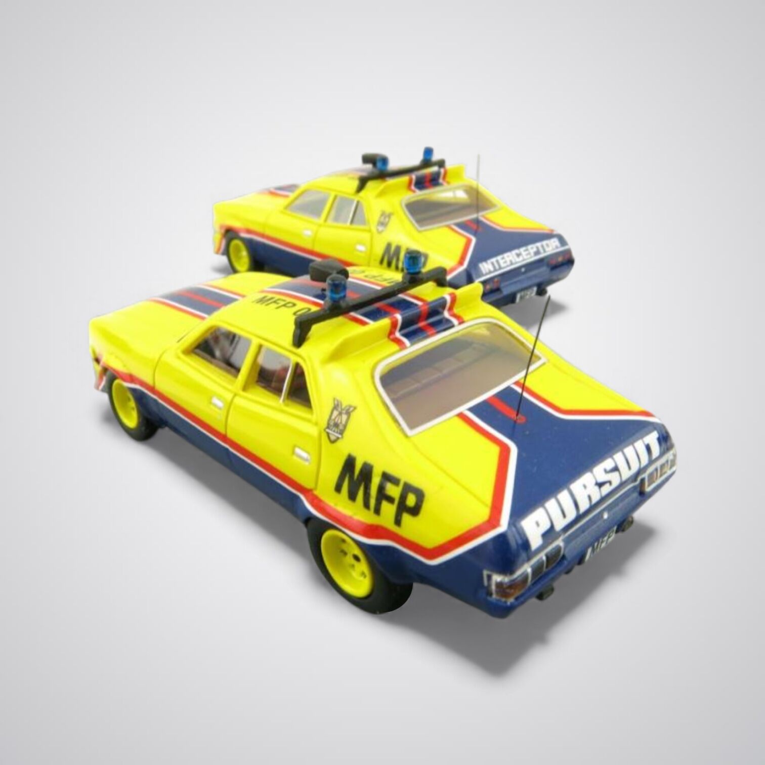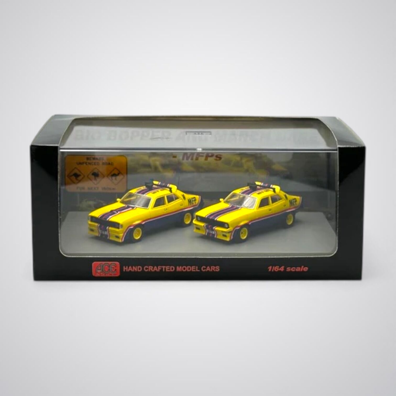 ACE Model Cars have once again produced this high quality Mad Max movie car twin set for your collection. This twin set features the "March Hare" Ford XA Falcon & "Big Bopper" Ford XB Falcon from the original Mad Max movie.