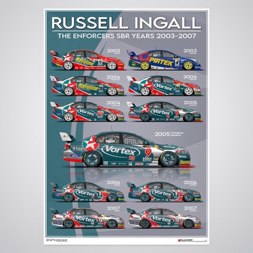 This special edition print celebrates The Enforcer Russell Ingall Stone Brothers Racing Years. Showcasing the SBR Ford Falcon V8 Supercars in a number of different liveries from Bathurst, early season through to the 2005 V8 Supercars Championship winning livery.